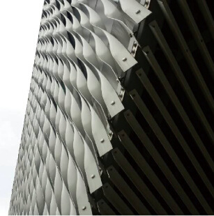 扭曲鋁單板可加工成各種弧形及異形,表面可噴涂成多種顏色,在墻面形成各種美麗的圖案;并且可以和玻璃幕墻等組合成不同的外觀形體,使建筑物更具高貴典雅的風(fēng)格。
