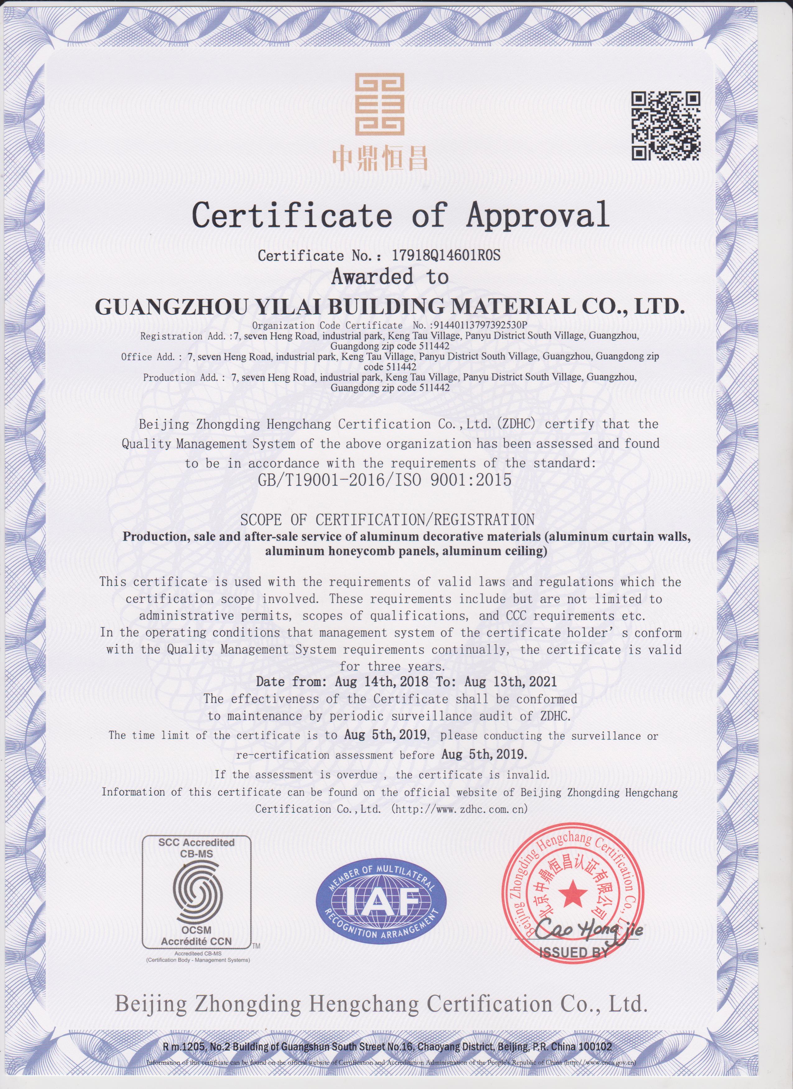 質(zhì)量管理體系認(rèn)證證書(英文版)