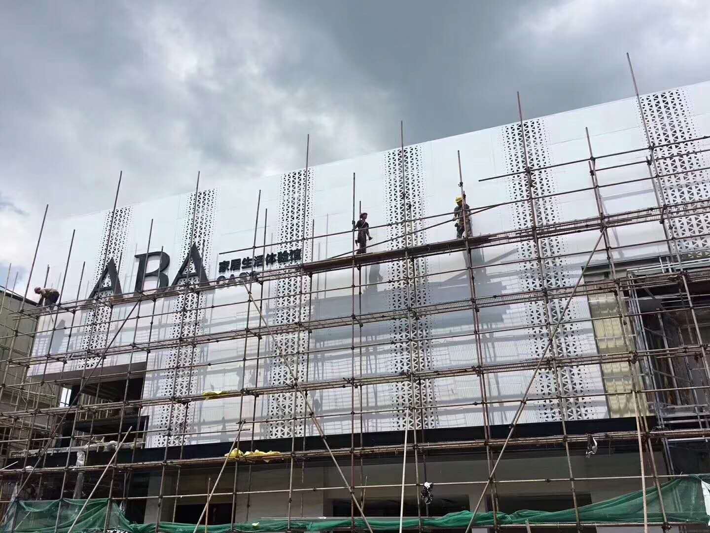 鋁單板立面由分縫處斷開成獨立的板塊,分別安裝。板縫的處理多為開縫、打膠、塞膠條等形式。板縫的布置由分格尺寸確定。2飯縫的寬度取決于視覺效果、安裝工藝、密封要求等。視覺上板縫寬度應該與建筑風格保持一致或近似。板縫過小容易造成安裝困難且密封膠因伸縮量不夠而撕裂;板縫過大則密封膠用量增加且容易起泡。