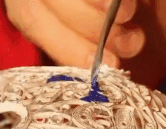 燒藍(lán) 是將整個(gè)胎體填滿色釉后,再拿到爐溫大約800℃的高爐中烘燒,色釉由砂粒狀固體熔化為液體,待冷卻后成為固著在胎體上的絢麗的色釉,此時(shí)色釉低于銅絲高度,所以得再填一次色釉,再經(jīng)燒結(jié),一般要連續(xù)四五次,直至將紋樣內(nèi)填到與掐絲紋相平。