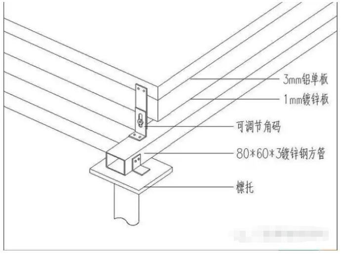 2、鋁單板-保溫夾芯板連接角碼用拉鉚釘固定,應(yīng)固定牢固、位置正確。