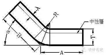 4.3 R≠0 θ=90° L=(A-T-R)+(B-T-R)+(R+λ)*π/2 當(dāng)R ≧5T時(shí) λ=T/2 1T≦ R <5T λ=T/3 0 < R <T λ=T/4 (實(shí)際展開(kāi)時(shí)除使用尺寸計(jì)算方法外,也可在確定中性層位置后,通過(guò)偏移再實(shí)際測(cè)量長(zhǎng)度的方法.以下相同) |