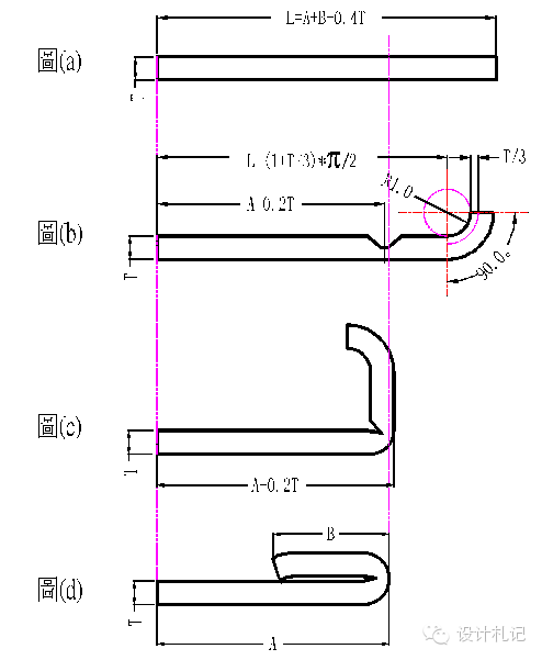 4.13側(cè)沖壓平 圖(a): 展開(kāi)長(zhǎng)度 L=A+B-0.4T 圖(b): 壓線(xiàn)位置尺寸 A-0.2T 圖(c): 90°折彎處尺寸為A+1.0T 圖(d): 側(cè)沖壓平后的產(chǎn)品形狀 |