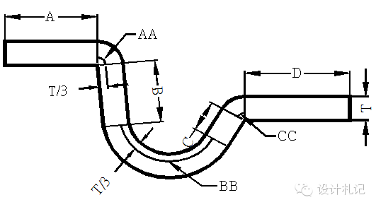 4.14 綜合計(jì)算如圖: L=料內(nèi)+料內(nèi)+補(bǔ)償量 =A+B+C+D +中性層弧長(zhǎng)(AA+BB+CC) (中性層弧長(zhǎng)均按 “中性層到板料內(nèi)側(cè)距離λ=T/3”來(lái)計(jì)算) |