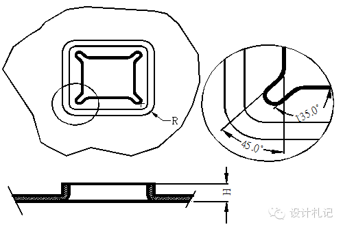 4.9 方形抽孔 方形抽孔,當(dāng)抽孔高度較高時(shí)(H>Hmax),直邊部展開(kāi)與彎曲一致, 圓角處展開(kāi)按保留抽高為H=Hmax的大小套彎曲公式展開(kāi),連接處用45度線(xiàn)及圓角均勻過(guò)渡, 當(dāng)抽孔高度不高時(shí)(H≦Hmax)直邊部展開(kāi)與彎曲一致,圓角處展開(kāi)保留與直邊一樣的偏移值. 以下Hmax取值原則供參考. 當(dāng)R≧4MM時(shí): 材料厚度T=1.2~1.4取Hmax =4T 材料厚度T=0.8~1.0取Hmax =5T 材料厚度T=0.7~0.8取Hmax =6T 材料厚度T≦0.6取Hmax =8T 當(dāng)R<4MM時(shí),請(qǐng)示上級(jí). |